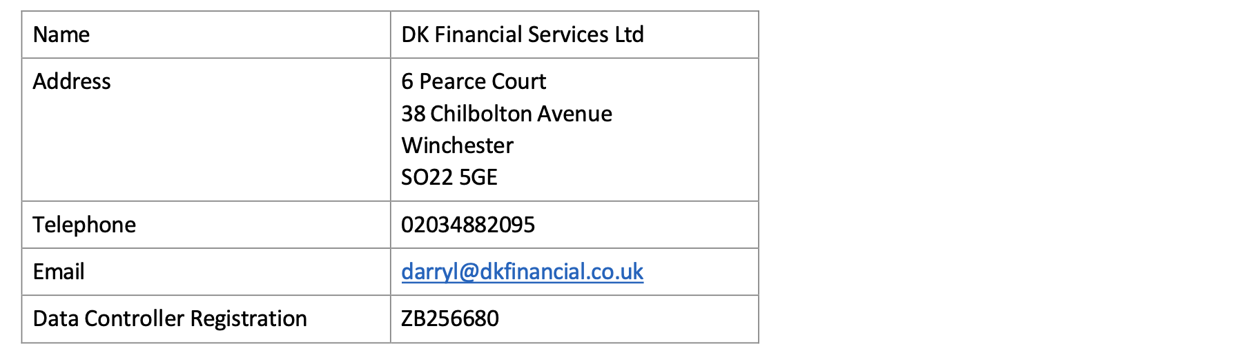 If you would like further details on how we use your personal information or if you have any data protection queries, please write to: The Data Protection Officer, DK Financial Services Ltd, 6 Pearce Court, 38 Chilbolton Avenue, Winchester SO22 5GE